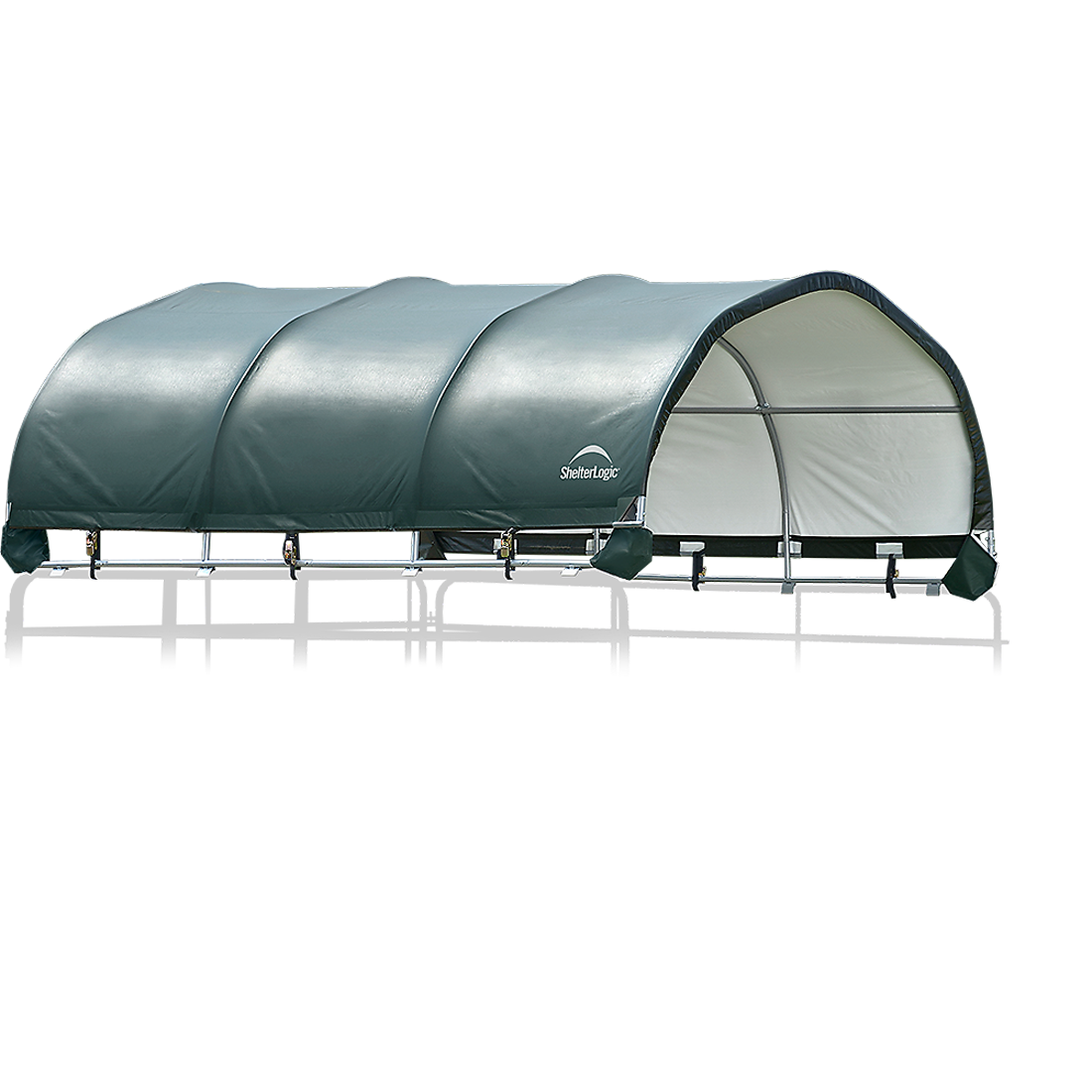 The Corral Shelter livestock shade is a multi-purpose, portable shade and shelter structure and one of our most convenient equine innovations, yet. Our portable shade solution has a sturdy frame with a premium powder-coated finish to resist rust and corrosion. The universal cover fits most panel tube profiles (whether round, square or oval) tightly and securely to provide reliable shade protection anywhere in the field for horses, goats, and most livestock. The unit features patented ShelterLock Steel Stabilizers and anchors securely to the ground for reliable shade.