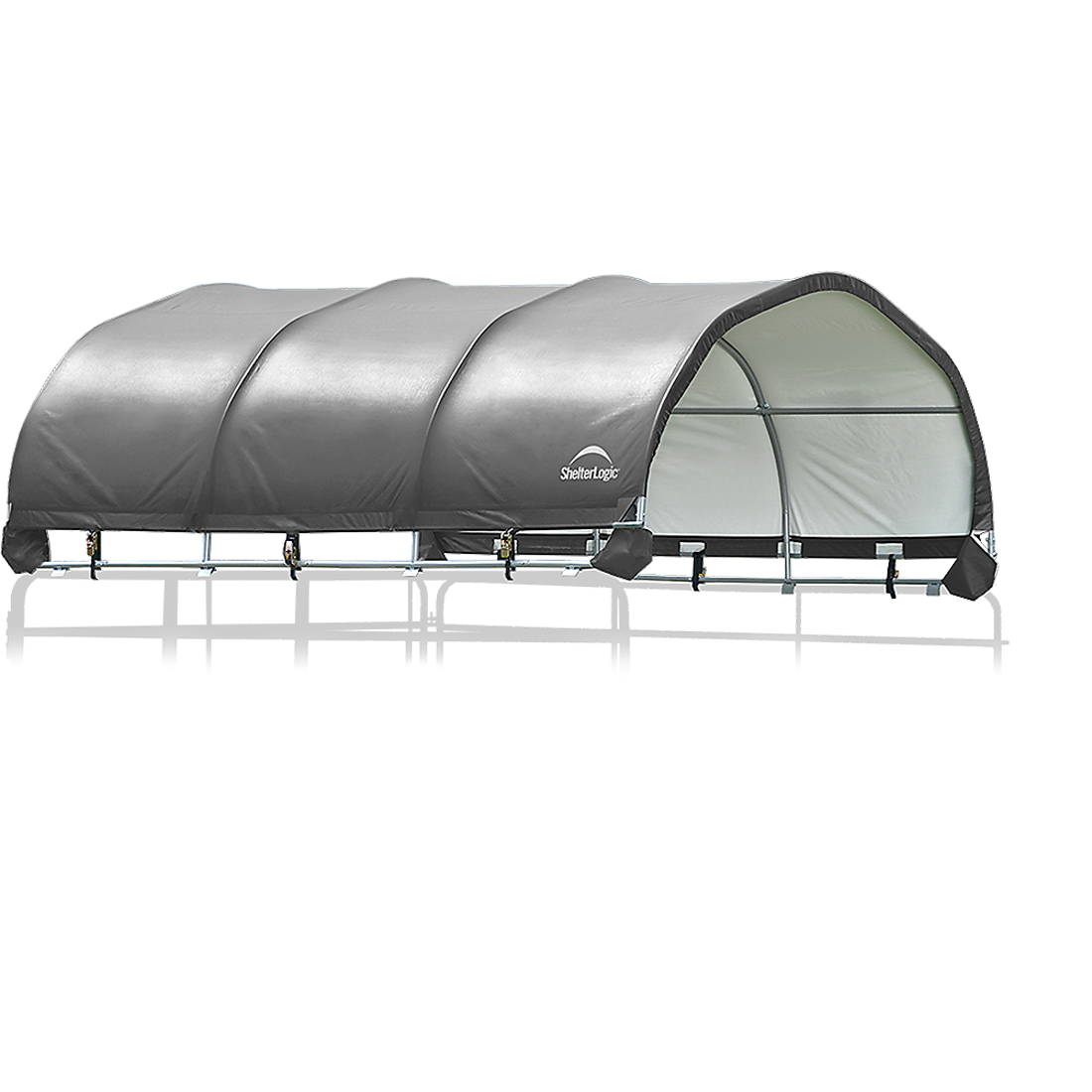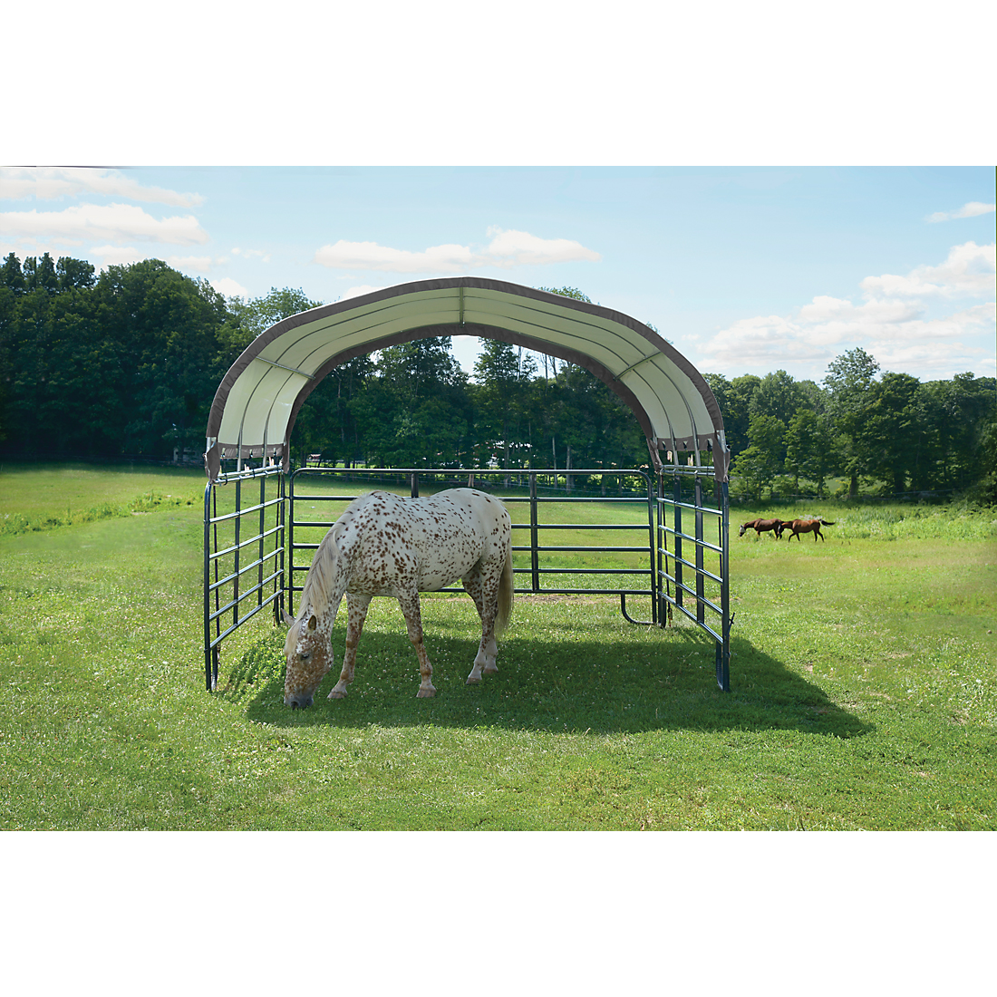 The Corral Shelter livestock shade is a multi-purpose, portable shade and shelter structure and one of our most convenient equine innovations, yet. Our portable shade solution has a sturdy frame with a premium powder-coated finish to resist rust and corrosion. The universal cover fits most panel tube profiles (whether round, square or oval) tightly and securely to provide reliable shade protection anywhere in the field for horses, goats, and most livestock. The unit features patented ShelterLock Steel Stabilizers and anchors securely to the ground for reliable shade.