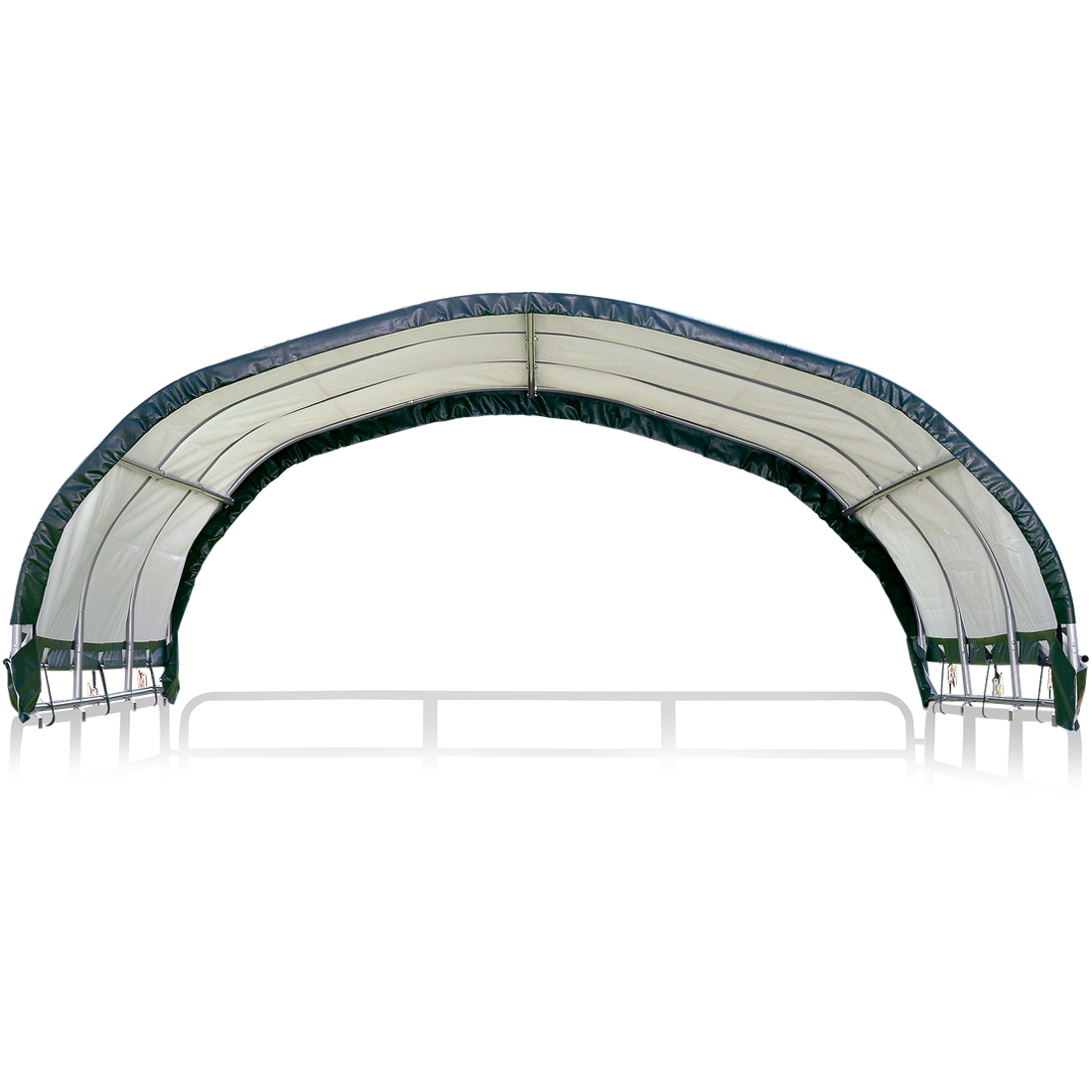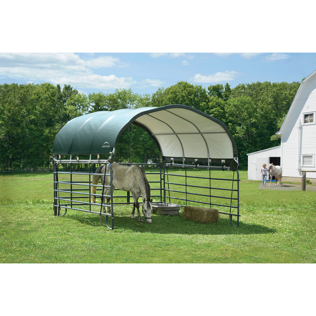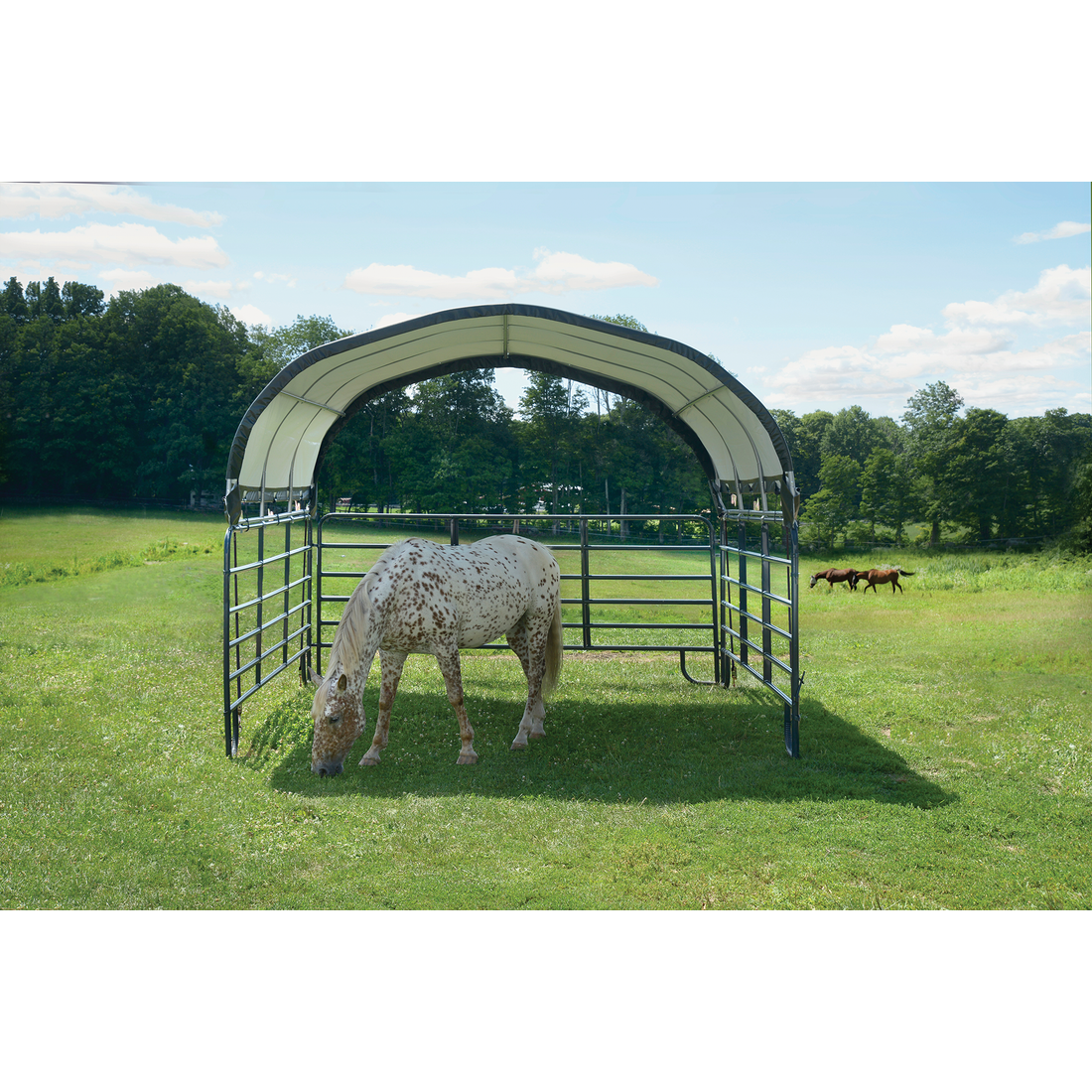 The Corral Shelter livestock shade is a multi-purpose, portable shade and shelter structure and one of our most convenient equine innovations, yet. Engineered and built in the U.S.A., and made of 100% ASTM A500 galvanized steel; it is a sturdy, durable, portable shade solution. The universal cover fits most panel tube profiles (whether round, square or oval) tightly and securely to provide reliable shade protection anywhere in the field for horses, goats, most livestock, and even agricultural storage. The unit features patented ShelterLock Steel Stabilizers and anchors securely to the ground for reliable shade.