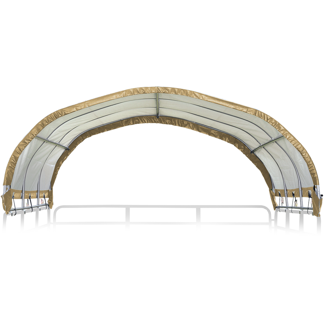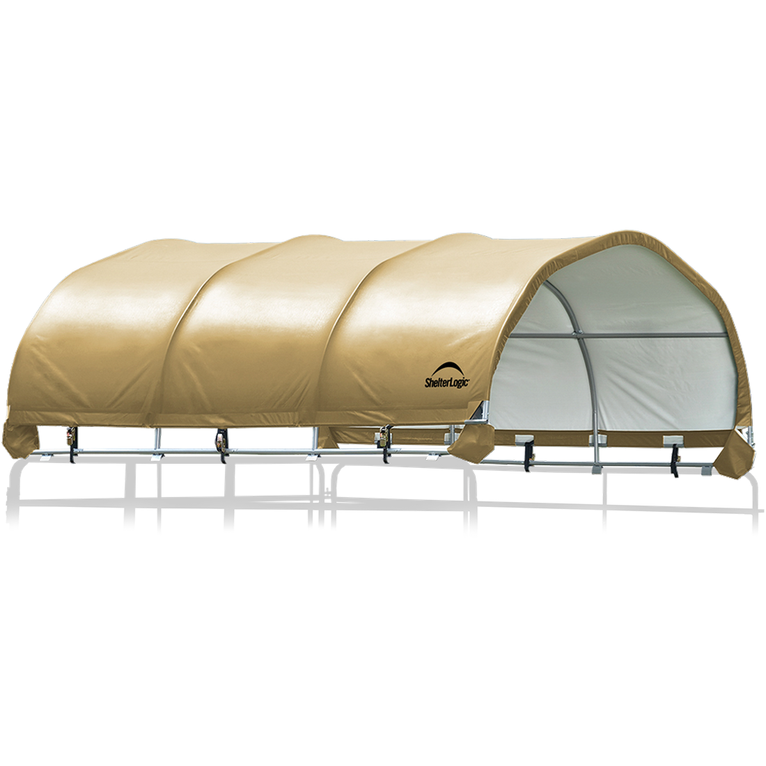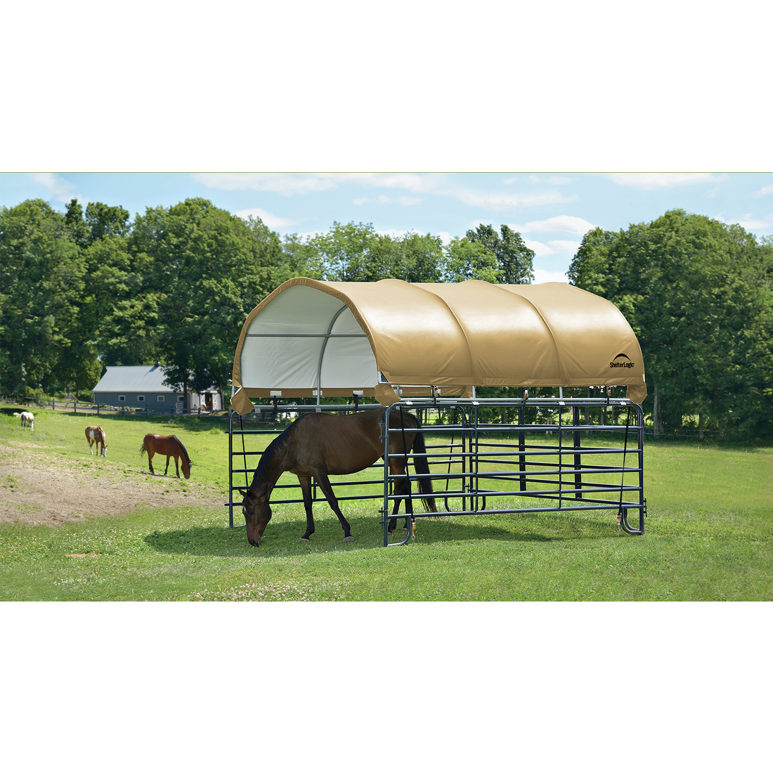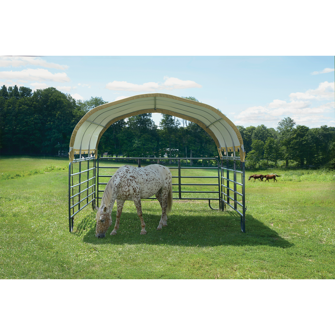 The Corral Shelter livestock shade is a multi-purpose, portable shade and shelter structure and one of our most convenient equine innovations, yet. Engineered and built in the U.S.A., and made of 100% ASTM A500 galvanized steel; it is a sturdy, durable, portable shade solution. The universal cover fits most panel tube profiles (whether round, square or oval) tightly and securely to provide reliable shade protection anywhere in the field for horses, goats, most livestock, and even agricultural storage. The unit features patented ShelterLock Steel Stabilizers and anchors securely to the ground for reliable shade.