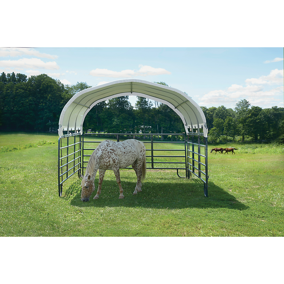 The Corral Shelter livestock shade is a multi-purpose, portable shade and shelter structure and one of our most convenient equine innovations, yet. Our portable shade solution has a sturdy frame with a premium powder-coated finish to resist rust and corrosion. The universal cover fits most panel tube profiles (whether round, square or oval) tightly and securely to provide reliable shade protection anywhere in the field for horses, goats, and most livestock. The unit features patented ShelterLock Steel Stabilizers and anchors securely to the ground for reliable shade.