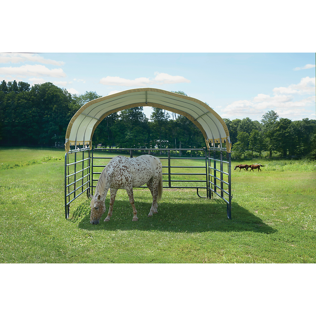 The Corral Shelter livestock shade is a multi-purpose, portable shade and shelter structure and one of our most convenient equine innovations, yet. Our portable shade solution has a sturdy frame with a premium powder-coated finish to resist rust and corrosion. The universal cover fits most panel tube profiles (whether round, square or oval) tightly and securely to provide reliable shade protection anywhere in the field for horses, goats, and most livestock. The unit features patented ShelterLock Steel Stabilizers and anchors securely to the ground for reliable shade.