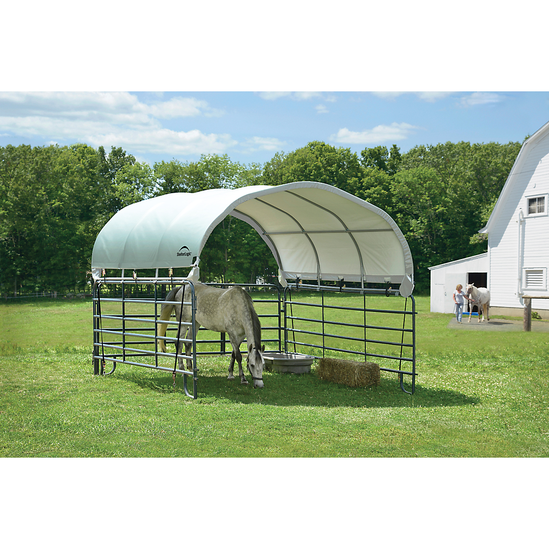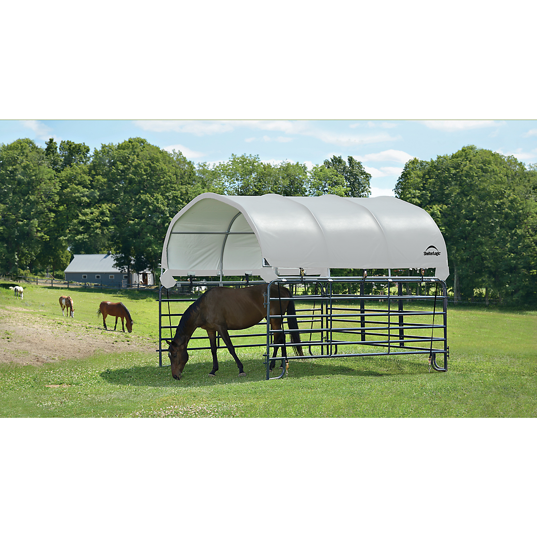 The Corral Shelter livestock shade is a multi-purpose, portable shade and shelter structure and one of our most convenient equine innovations, yet. Our portable shade solution has a sturdy frame with a premium powder-coated finish to resist rust and corrosion. The universal cover fits most panel tube profiles (whether round, square or oval) tightly and securely to provide reliable shade protection anywhere in the field for horses, goats, and most livestock. The unit features patented ShelterLock Steel Stabilizers and anchors securely to the ground for reliable shade.