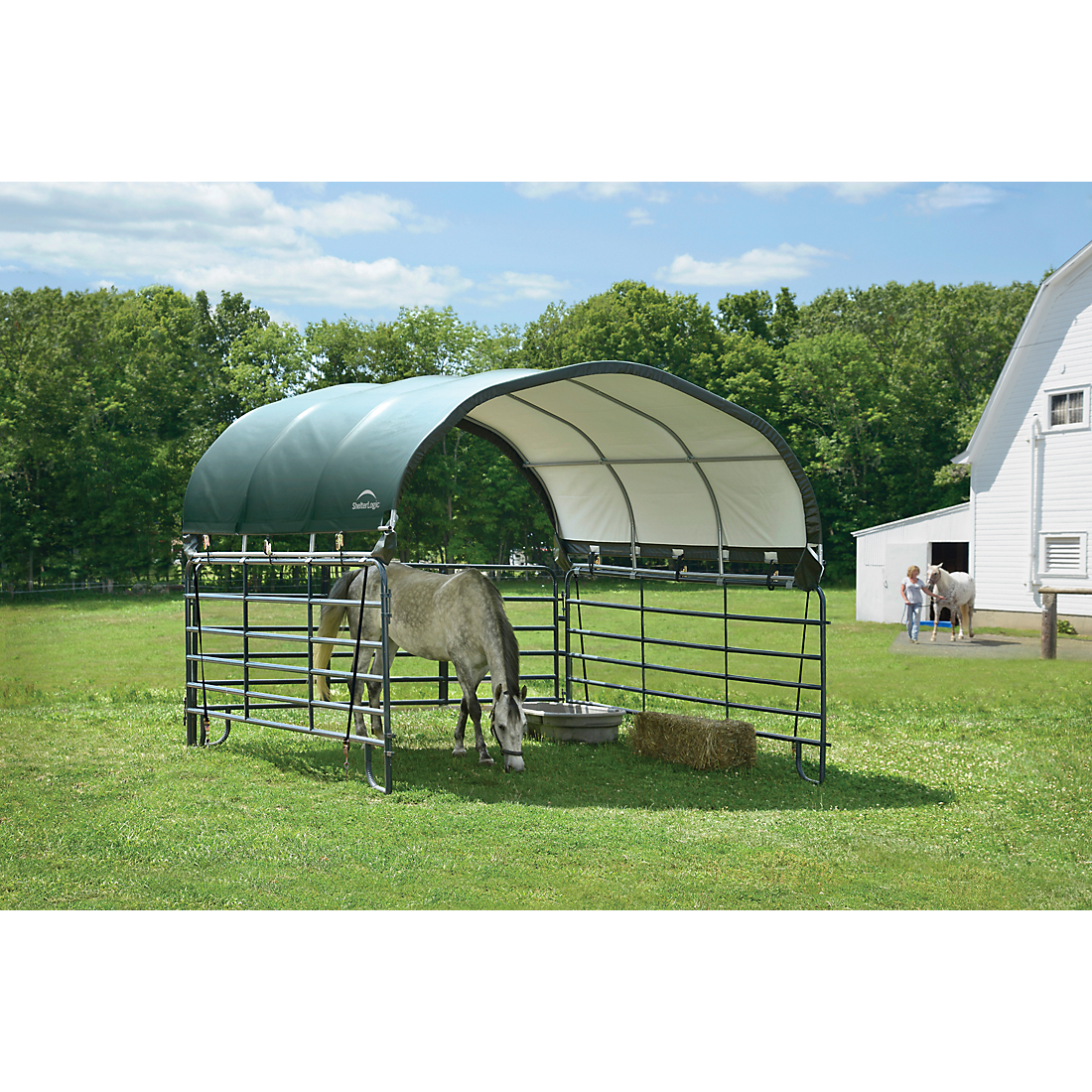 The Corral Shelter livestock shade is a multi-purpose, portable shade and shelter structure and one of our most convenient equine innovations, yet. Our portable shade solution has a sturdy frame with a premium powder-coated finish to resist rust and corrosion. The universal cover fits most panel tube profiles (whether round, square or oval) tightly and securely to provide reliable shade protection anywhere in the field for horses, goats, and most livestock. The unit features patented ShelterLock Steel Stabilizers and anchors securely to the ground for reliable shade.