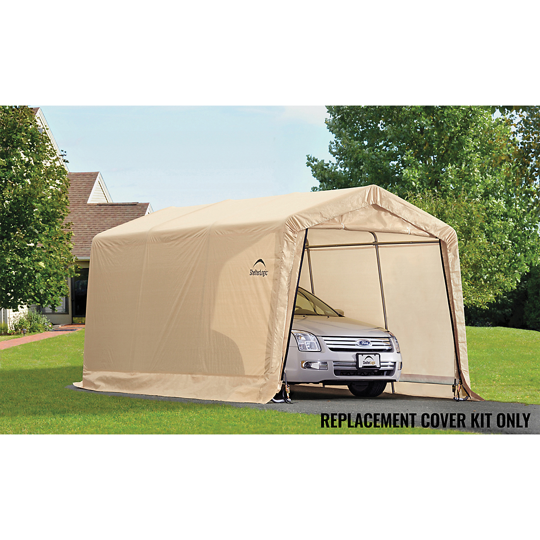 The AutoShelter® 10 x 15 x 8 ft. Replacement Cover Kit replaces your existing ShelterLogic AutoShelter 10 x 15 x 8 ft. cover and end panels. The 100% waterproof ShelterLogic fabric replacement cover is made strong and has been UV treated inside and out to prevent and reduce fading and deterioration from harmful UV rays. Available in Standard, Heavy Duty 14.5 oz. and Ultra Duty 21.5 oz. See the chart for details. COVER KIT ONLY, FRAME SOLD SEPARATELY.