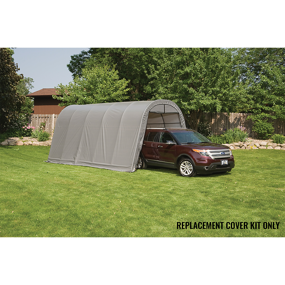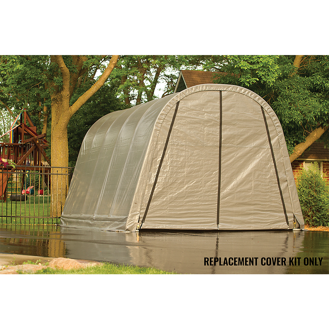 The Garage-in-a-Box® Round 12 x 20 x 10 ft. Replacement Cover Kit replaces your existing ShelterLogic Garage-in-a-Box Round 12 x 20 x 10 ft. cover and end panels. The 100% waterproof ShelterLogic fabric replacement cover is made strong and has been UV treated inside and out to prevent and reduce fading and deterioration from harmful UV rays. Available in Standard, Heavy Duty 14.5 oz. and Ultra Duty 21.5 oz. See the chart for details. COVER KIT ONLY, FRAME SOLD SEPARATELY.