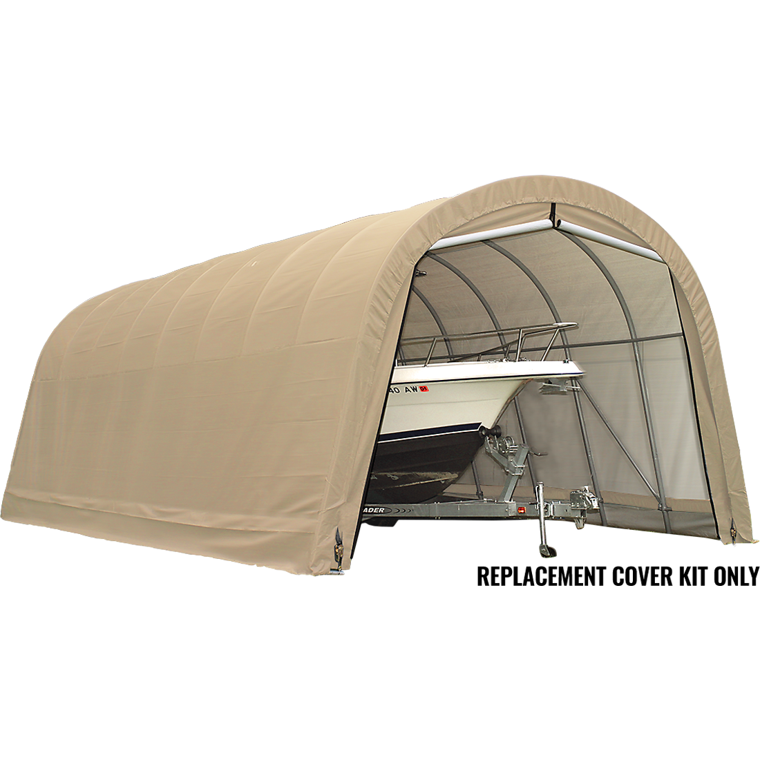 The Garage-in-a-Box® 14 x 32 x 12 ft. Replacement Cover Kit replaces your existing ShelterLogic Garage-in-a-Box Round 14 x 32 x 12 ft. cover and end panels. The 100% waterproof ShelterLogic fabric replacement cover is made strong and has been UV treated inside and out to prevent and reduce fading and deterioration from harmful UV rays. Available in Standard, Heavy Duty 14.5 oz. and Ultra Duty 21.5 oz. See the chart for details. COVER KIT ONLY, FRAME SOLD SEPARATELY.