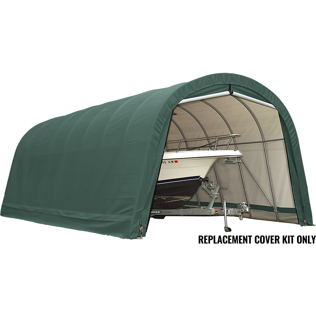 The Garage-in-a-Box® 14 x 32 x 12 ft. Replacement Cover Kit replaces your existing ShelterLogic Garage-in-a-Box Round 14 x 32 x 12 ft. cover and end panels. The 100% waterproof ShelterLogic fabric replacement cover is made strong and has been UV treated inside and out to prevent and reduce fading and deterioration from harmful UV rays. Available in Standard, Heavy Duty 14.5 oz. and Ultra Duty 21.5 oz. See the chart for details. COVER KIT ONLY, FRAME SOLD SEPARATELY.