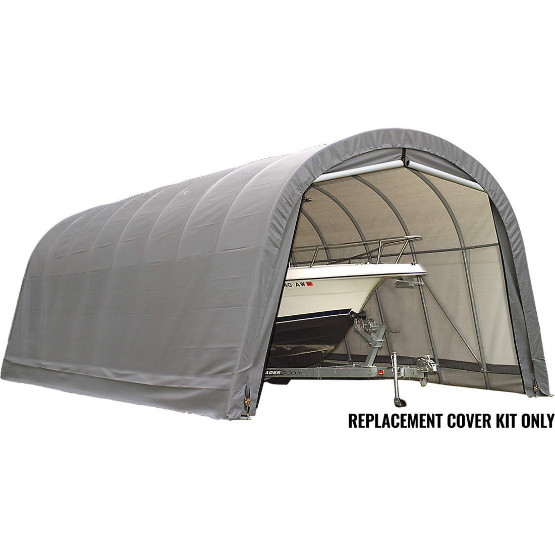 The Garage-in-a-Box® 14 x 32 x 12 ft. Replacement Cover Kit replaces your existing ShelterLogic Garage-in-a-Box Round 14 x 32 x 12 ft. cover and end panels. The 100% waterproof ShelterLogic fabric replacement cover is made strong and has been UV treated inside and out to prevent and reduce fading and deterioration from harmful UV rays. Available in Standard, Heavy Duty 14.5 oz. and Ultra Duty 21.5 oz. See the chart for details. COVER KIT ONLY, FRAME SOLD SEPARATELY.