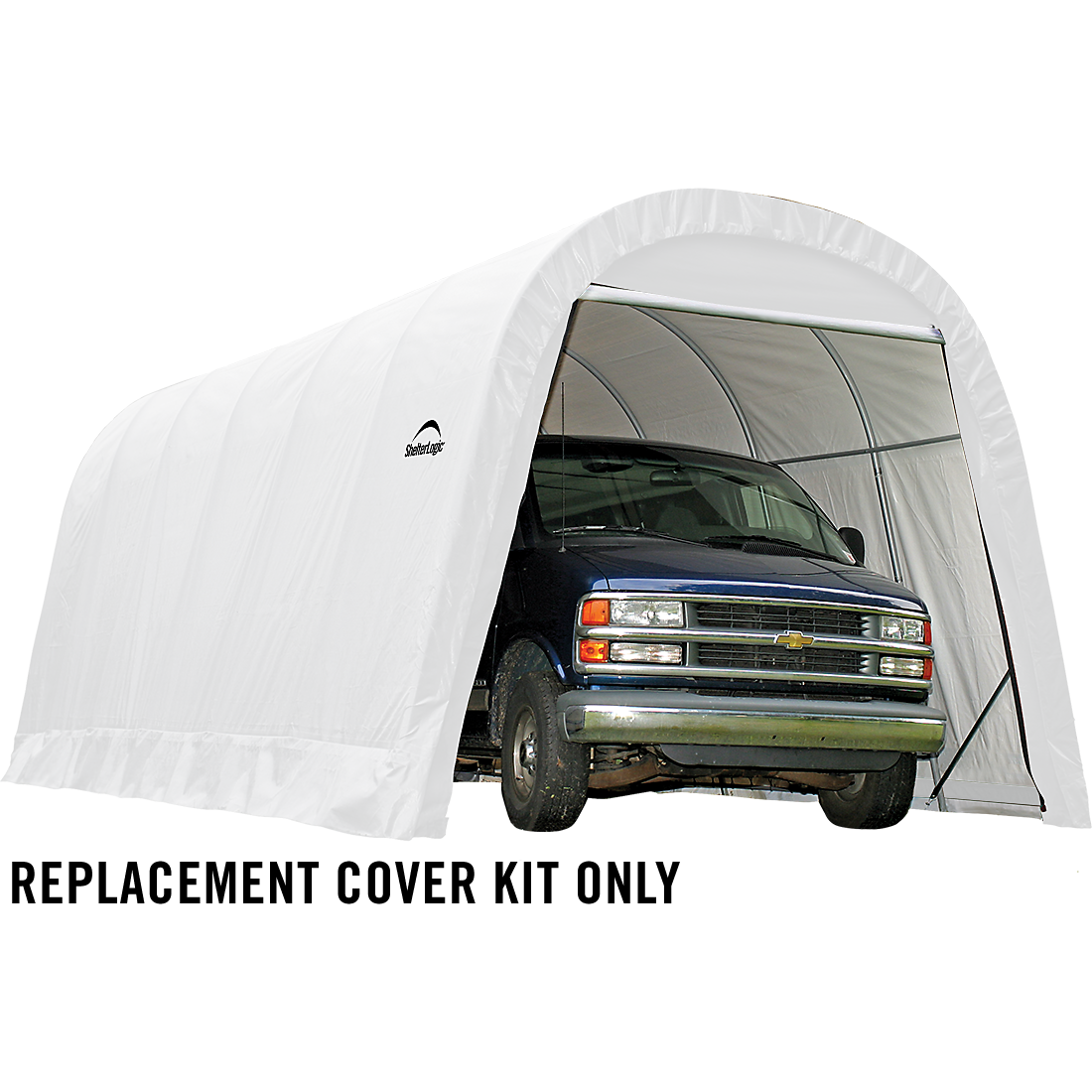 The round Garage-in-a-Box® 15 x 40 x 16 ft. Replacement Cover Kit replaces your existing ShelterLogic Garage-in-a-Box round 15 x 40 x 16 ft. cover and end panels. The 100% waterproof ShelterLogic fabric replacement cover is made strong and has been UV treated inside and out to prevent and reduce fading and deterioration from harmful UV rays. Available in Standard, Heavy Duty 14.5 oz. and Ultra Duty 21.5 oz. See the chart for details. COVER KIT ONLY, FRAME SOLD SEPARATELY.