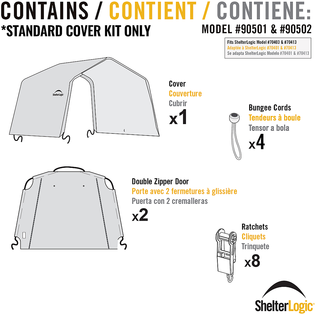 The Shed-in-a-Box® 6 x 10 x 6 ft. 6 in. Replacement Cover Kit replaces your existing ShelterLogic Shed-in-a-Box 6 x 10 x 6 ft. 6 in. cover and end panels. The 100% waterproof ShelterLogic fabric replacement cover is made strong and has been UV treated inside and out to prevent and reduce fading and deterioration from harmful UV rays. Available in Standard, Heavy Duty 14.5 oz. and Ultra Duty 21.5 oz. See the chart for details. COVER KIT ONLY, FRAME SOLD SEPARATELY.